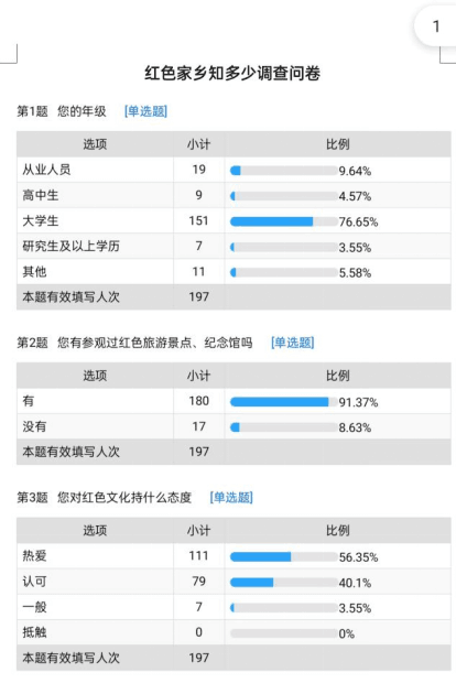 畅游红色故土,饱览大好河山。活动伊始,线上志愿者们将问卷分享到朋友圈、QQ空间等社交平台大力宣传,线下走访答题相结合的方式邀请市民参与调研问卷的填写,并在填写问卷完毕之后向参与群众讲红色旅游景点相关故事及意义,并号召所有人为保护红色文化献力。通过志愿者们的共同努力,共收回197份有效问卷。经调查数据显示,有91%的被调查者曾参观过红色景点,8%被调查者未有参观史,这一现象表明,更多的年轻人重视红色旅游文化。同时,有45%的被调查者了解并清楚家乡附近红色旅游景点,不清楚者则高达55%,说明老员工对于周围的景点以及基地了解不彻底,有待提高。随后,志愿者们通过分析得出结论:应当让更多的老员工了解到红色文化的重要性,使之明确弘扬红色精神是每个中国青年的责任;同时,对待传统文化应取其精华,去其糟粕,紧追时代潮流,结合发展实际。活动结束后,赵喆同学表示,只有深入问题,才能发现问题,在这次问卷调查中,确实发现了一些问题,比如老员工对于红色文化的认识不够、并不看重红色文化等。