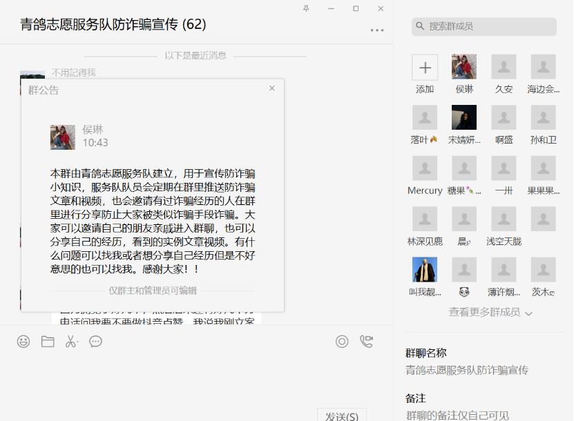 活动伊始,志愿者们通过组建防诈骗宣传微信群的方式,邀请员工们加入其中,定时向同学们推送典型的诈骗手段、犯罪案例与安全教育视频,带领大家共同学习,帮助同学们不断提高警惕意识与防诈骗能力。宣传群中,志愿者们围绕“网络电信诈骗”的主题,通过生动形象的短片向同学们普及电信诈骗的概念、新型电信网络诈骗的主要类型等内容,并邀请受骗者向同学们讲述真实的受骗经历。同时,志愿者们从身边的案例入手,向附近群众展示最近身边发生的多起电信诈骗事件,提醒人们提高防范意识,远离电信诈骗。志愿者们着重向人们介绍诈骗分子惯用诈骗手段,如刷单诈骗、冒充好友诈骗以及网络兼职诈骗等,帮助人们辨识和认清这些犯罪手段套路背后的真面目,从而减少网络诈骗事件的发生。