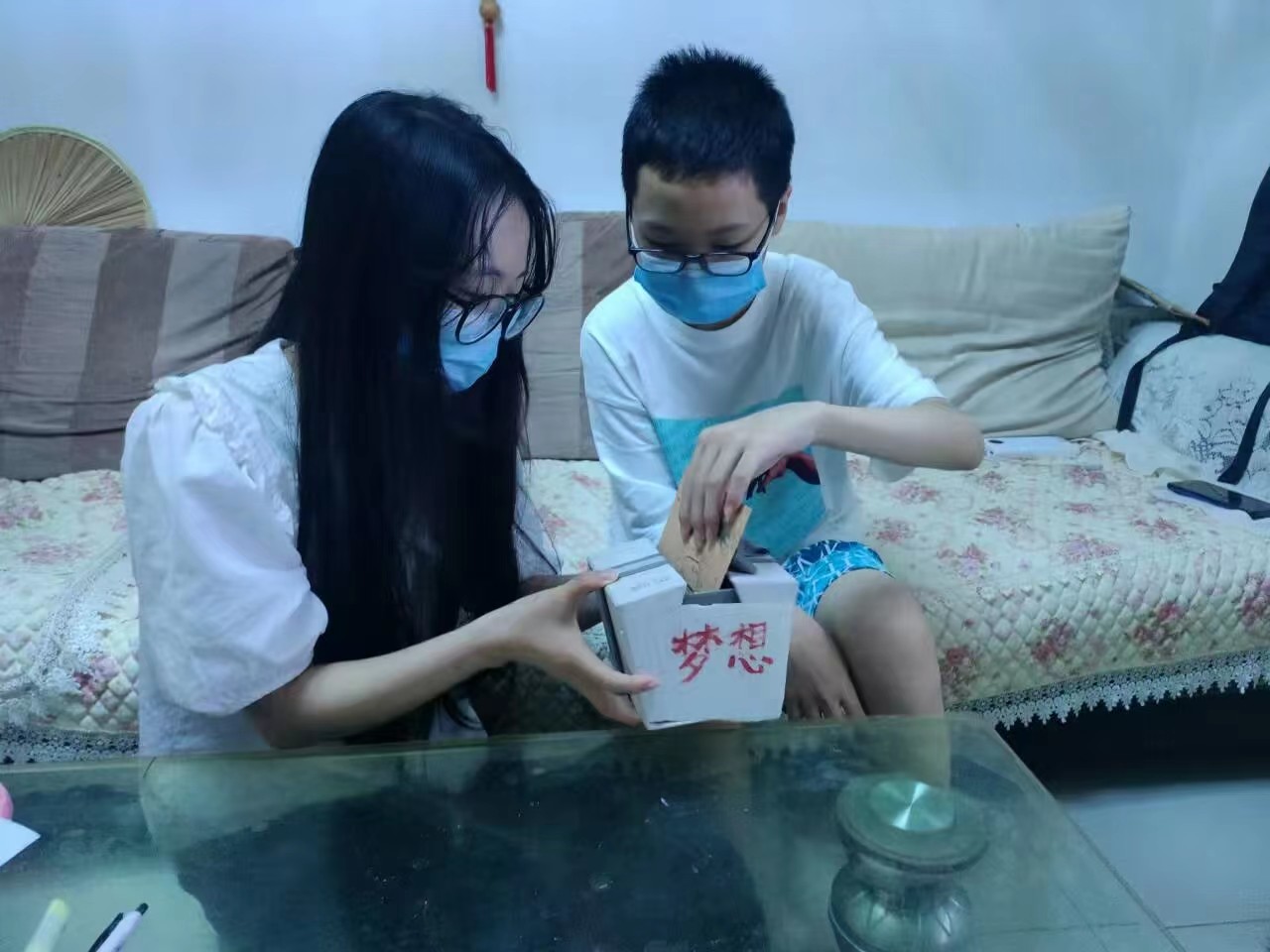 点亮伟大中国梦,信箱之中存梦想。活动前期,首先由志愿者进行充分的活动准备工作,准备信封和信纸,制作信箱并准备装饰物,其次由活动参与人员提前了解港天航空精神和新时代伟大中国梦以便于讲解,确保活动顺利高效进行。活动中期,先由志愿者带领活动参与人员观看航州十三号发射视频,感受每一位航天人坚持不懈的努力和日复一日的付出,感受他们热爱祖国、为国争光的坚定信念以及勤于探索、勇于创新、相信科学的优秀品质,从中感悟伟大的中国梦,并将自己的梦想融入其中。视频播放完毕,活动参与人员在志愿者的指引下,在指定位置集合后对梦想展开了交流与探讨,展示了青少年的志气蓬勃。随后用信纸描绘自己的梦想并存放在信封中,并由志愿者组织活动参与人员对梦想信箱进行装饰美化,表达对未来的美好期望。通过发挥自身想象力,活动参与人员挥动笔墨用心装点信箱,并依次亲手将写有自己梦想的信封投入梦想信箱中,最后共同封存梦想信箱,同时将梦想牢记心中。活动结束后,志愿者和活动参与人员纷纷表示此次活动使他们受益匪浅,不仅树立属于自己的梦想,还将伟大中国梦融入自己的梦想,对未来的自己和国家充满希望。