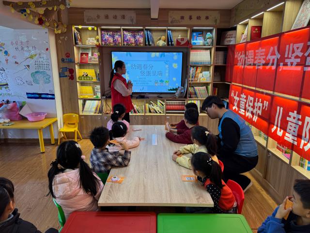 活动伊始,志愿者带领小朋友们翻开《采春茶》的绘本故事,用通俗易懂的语言讲述了春分时节贝儿跟着舅妈走进茶园,体验采茶、制茶乐趣的故事,小朋友们听得津津有味,沉浸在贝儿的奇妙春分之旅中。志愿者通过播放视频,详细介绍了春分时节太阳直射赤道带来昼夜平分的天文现象,指出春分在传统农耕文化里的重要地位,以此加深他们对春分的认识与了解。手工制作环节,志愿者向小朋友们详细解释春分立蛋这一传统习俗的象征意义,鼓励他们充分发挥想象力用彩笔在熟鸡蛋上画出自己喜欢的图案,进行立蛋尝试,小朋友们纷纷动手实践,现场气氛热烈而温馨。