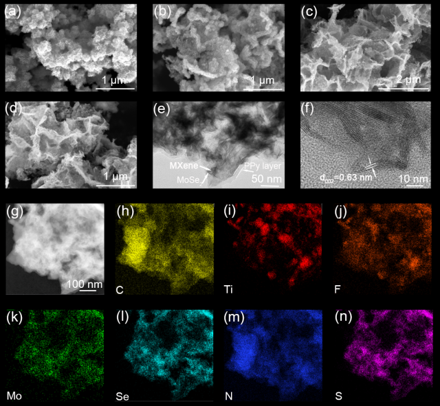 图1.a)MoSe2、(B)MoSe2@MXene和(c)-(d)PPy@MoSe2@MXene的SEM图像,PPy@MoSe2@MXene的(e)TEM、(f)HRTEM和(g)HAADF。PPy@MoSe2@MXene的C(h)、Ti(i)、F(j)、Mo(k)、Se(l)、N(m)和S(m)元素的相应映射图像。