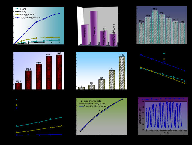 要点3:在300 mg L−1 UO2(NO3)2溶液中,PPy@MoSe2@MXene电极展现出卓越的铀提取能力,提取容量高达659 mg g−1,远高于其他对照组。此外,该材料在不同pH值下表现出最佳的铀提取性能(pH=5),且在不同电压下展现出高效的铀捕获能力。动力学模型分析表明,铀的吸附过程涉及物理吸附和化学吸附的协同作用,且PPy@MoSe2@MXene电极在低浓度铀溶液中展现出更高的吸附效率。经过多次吸附-解吸循环实验,PPy@MoSe2@MXene电极仍保持较高的铀提取能力,10次循环后吸附容量为276 mg g−1,占初始容量的80%。这表明该材料具有良好的可重复使用性,适合实际应用中的铀提取。
