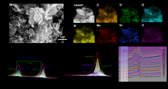要点4:原位拉曼光谱揭示了PPy@MoSe2@MXene在铀提取过程中的动态变化。在吸附过程中,材料表面逐渐出现U-O键的特征峰(715 cm−1),表明UO22+离子被成功还原为UO2并储存在材料内部。这一结果进一步证实了PPy@MoSe2@MXene在铀提取过程中通过赝电容嵌入和电沉积的协同作用实现高效的铀捕获。