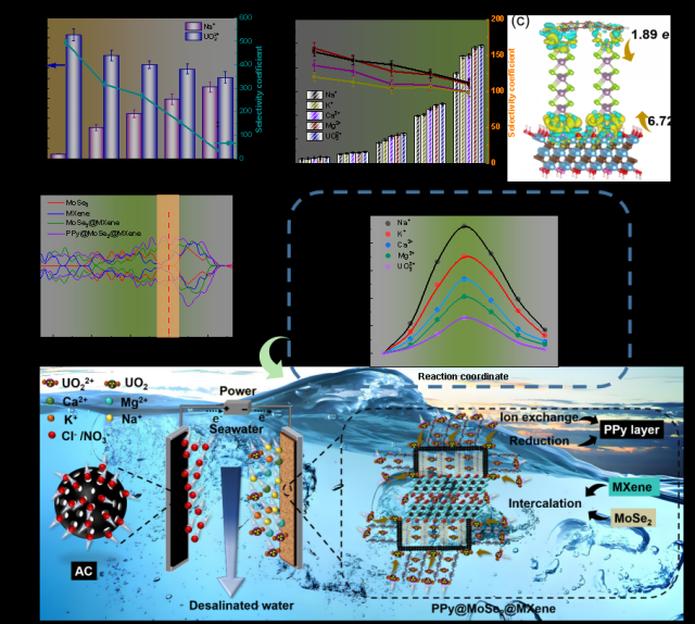 随着核能需求的增加,从海水中提取铀成为解决全球能源危机的重要途径。海水中铀资源丰富,但浓度极低且提取难度大。电容去离子化(CDI)技术因其高效、节能等优点被认为是提取铀的有力手段。然而,开发具有高吸附能力和选择性的电极材料仍然是一个挑战。本研究通过设计PPy@MoSe2@MXene复合材料,实现了高效、选择性的铀提取。